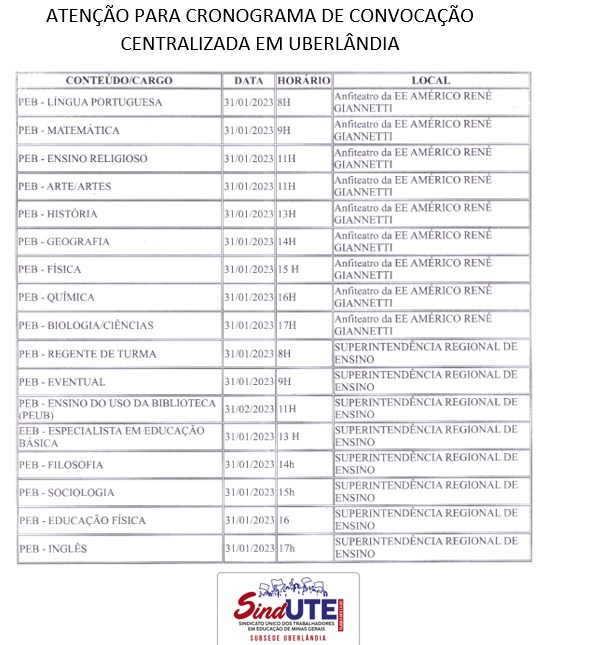 Cronograma de Convocação 30/01/2023 Download do Arquivo - PDF Atenção para o cronograma de convocação de Uberlândia! DATA: AMANHÃ (31/01).